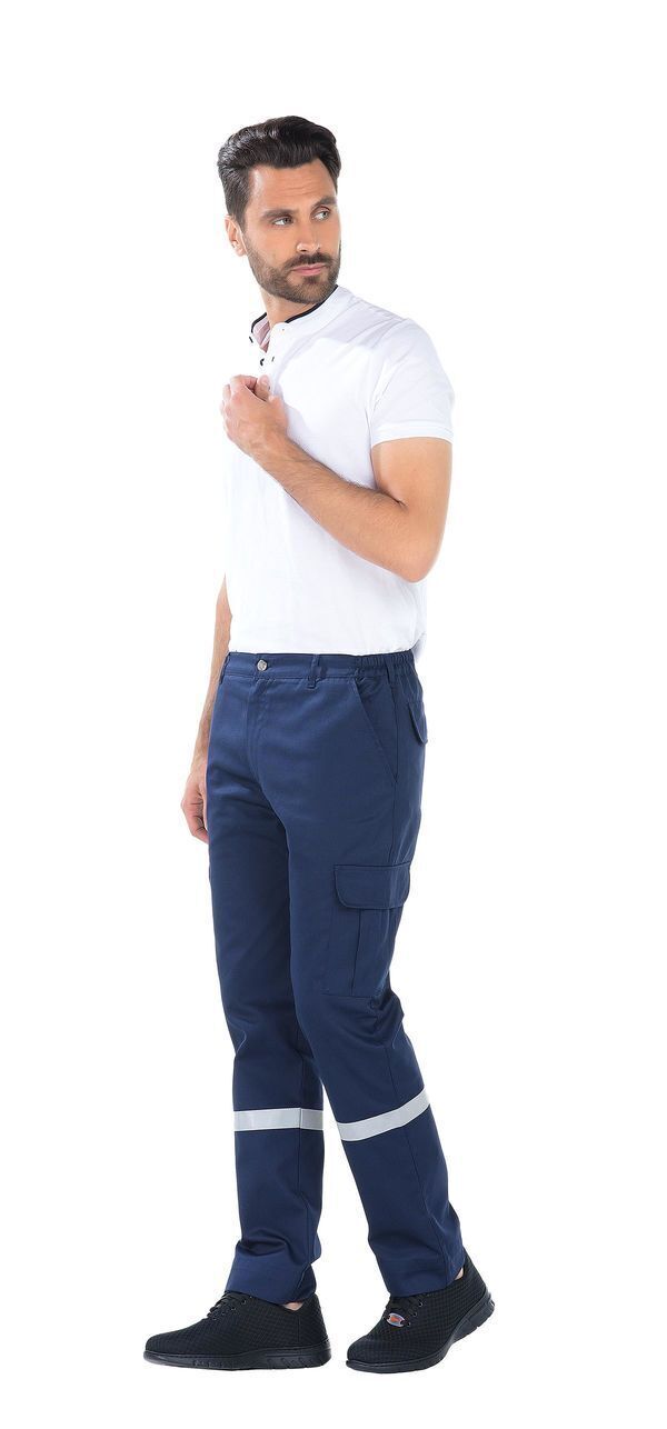 Pantalon ambulancier homme. Ceinture élastique côtés avec 7 passants. Braguette zippée. 2 poches italiennes. 2 poches cuisses à rabat fermé par Velcro®. Poche stylo sur cuisse droite. 2 poches arrières à rabat fermé par Velcro®. | Bandes rétroréfléchissantes 30 mm. E.J. : 78 cm (+ 6 cm).