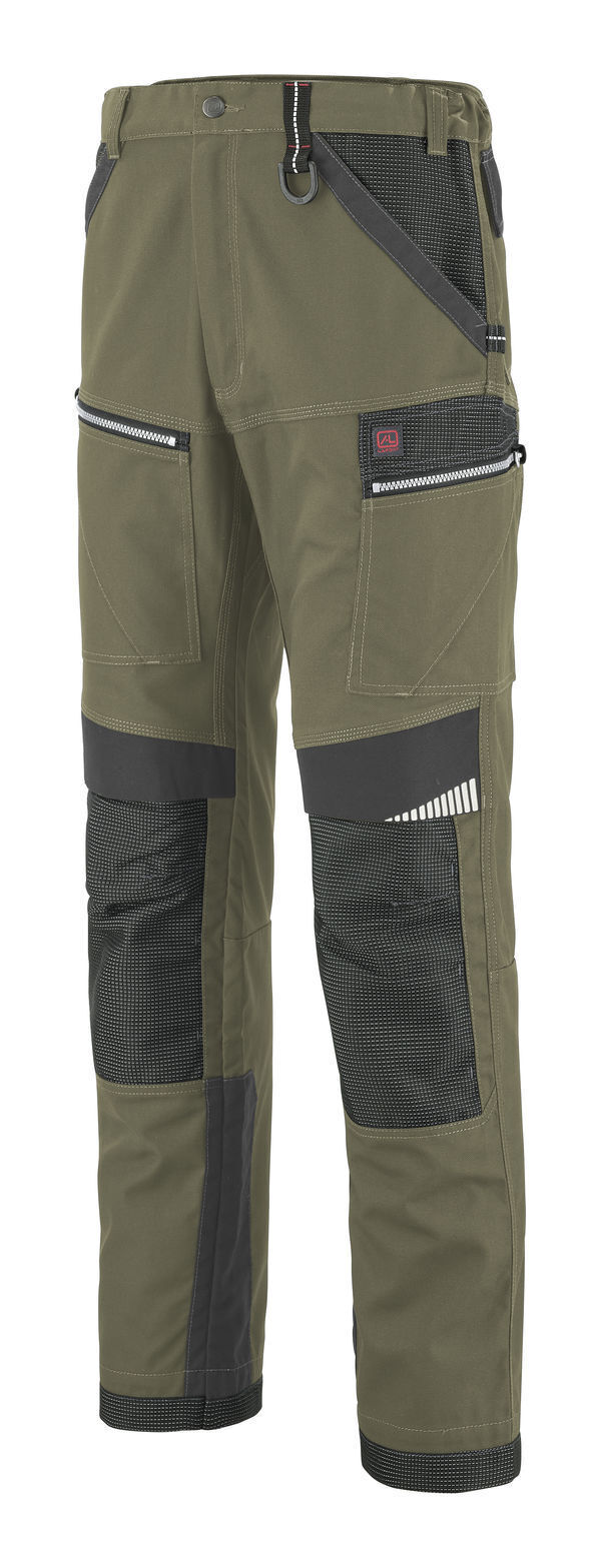 Pantalon à poches genouillères. Ceinture élastiquée côtés, 6 passants doubles. 2 poches italiennes dont 1 avec poche monnaie, 1 poche cuisse à soufflet avec rabat à grippers, 1 poche mètre en biais avec surpoche, 1 poche cuisse à rabat avec poche mètre intégrée et surpoche téléphone. 2 poches genouillères en tissu renforcé réglables en 2 niveaux de hauteur avec ouverture par le haut. Sangle porte-outils. Renforts arrières bas de jambes. E.J. : 82 cm + ourlet de 5 cm