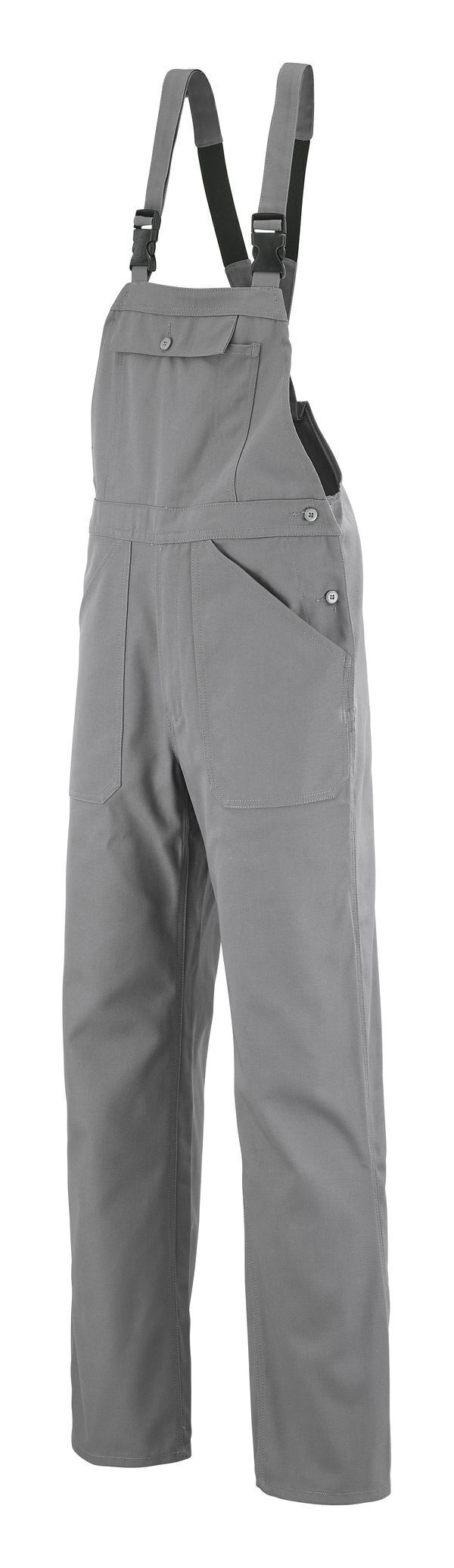 Cotte à bretelles. Bretelles avec boucles clic-clac. Fermeture devant à glissière bord à bord. 2 poches poitrine plaquées fermées par auto-agrippants. 2 poches italiennes. Poche cuisse à soufflet, rabat et surpoche smartphone. Double poche mètre. Poche revolver à l'arrière. Mercerie tout plastique. E.J. : 82 cm (+ 5 cm).