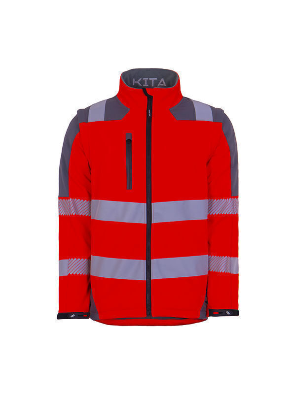 | Softshell haute visibilité 3 couches. Fermeture par glissière jusqu’en haut du col avec mentonnière. Curseur réversible pour fixation à la parka KITA®. 2 poches basses, poche poitrine fermée par glissière, 2 poches intérieures fermées par auto-agrippant. Dos couvre-reins. Manches préformées et amovibles par glissière. Blouson relevé de 2 ceintures, 2 brassards et demi-bretelles rétroréfléchissantes segmentées.