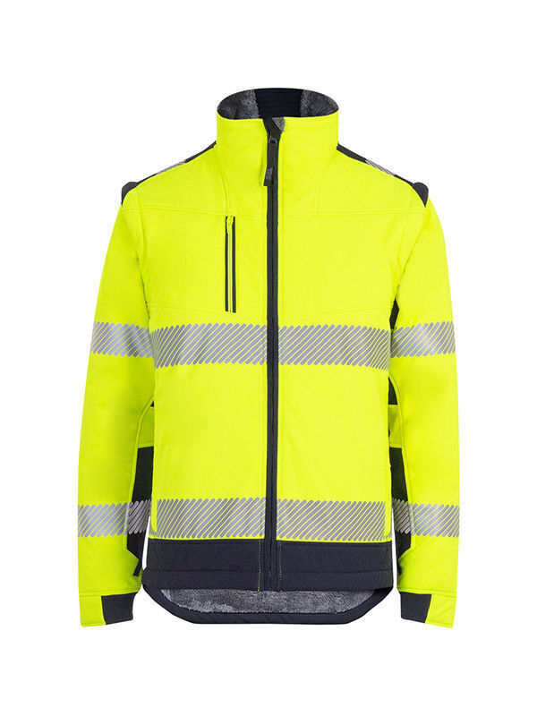Softshell haute visibilité 3 couches à manches amovibles. Fermeture centrale à glissière simple curseur réversible sous double passepoil, mentonnière. Manches amovibles préformées. Bord-côte aux poignets et au col. Dos protège-reins. Plusieurs poches. | Bandes rétroréfléchissantes microbilles segmentées RETHIOTEX® thermocollées. Fit&Zip : patte d’accroche au col et aux poignets pour fi xation dans une parka T2S.