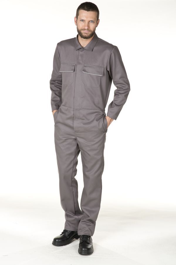Combinaison ignifugée. Fermeture devant par grippers cachés sous patte. Poche poitrine et poches basses plaquées par rabat souligné d’un passepoil rétroréfléchissant à grippers cachés. Manches montées. Bas de manches avec renfort intérieur tissu, poignets réglables. Poche intérieure. 2 poches basses dans les coutures latérales. Poche arrière fermée par rabat grippers cachés. | E.J. : 82 cm.
