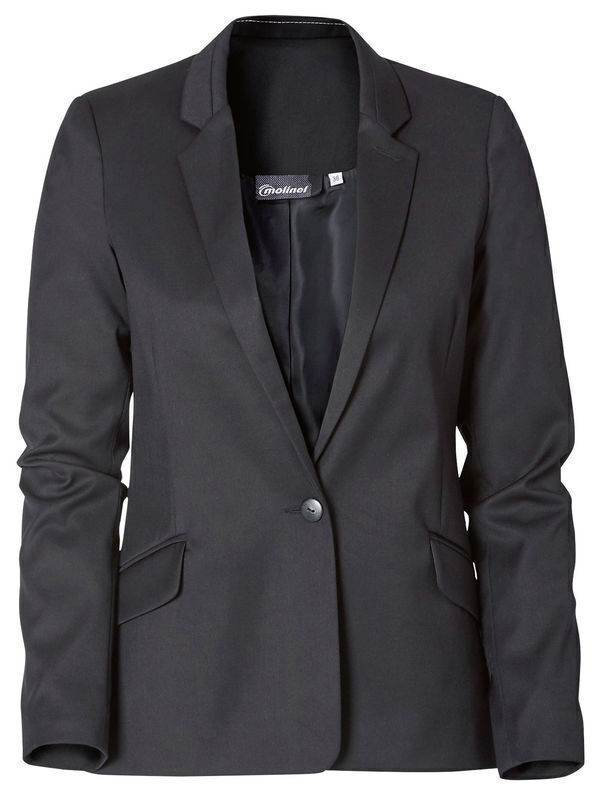 Veste femme fermeture 1 bouton. Col tailleur avec découpe et 1 fausse boutonnière. 2 pinces devant. 2 poches basses inclinées passepoilées avec rabat, poches intérieures. Fente dos. Bas arrondi.
