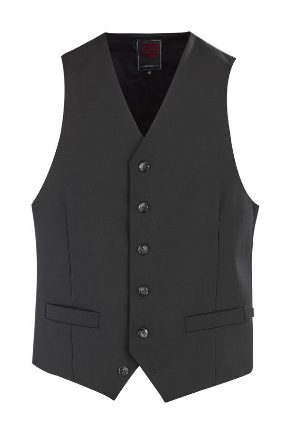 Gilet homme. Fermeture milieu devant par 5 boutons et 1 bouton décoratif effet corne sertis métal. Dos en doublure avec découpe milieu et pinces taille. Martingale en doublure avec boucle de réglage. 2 poches devant simple passepoil. Gilet entièrement doublé avec plis d’aisance. Coupe ajustée.
