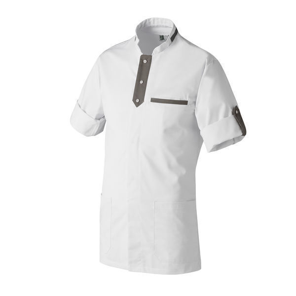 Tunique homme. Col officier fantaisie avec patte contrastée. Fermeture centrale par 6 pressions, dont 3 imitations boutons sur patte. Poche poitrine avec passepoil contrasté, 2 poches basses plaquées. Manches transformables avec pattes contrastées. Longueur : 80 cm.