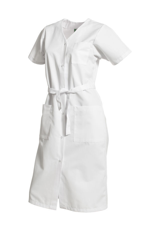 Blouse femme encolure V. Fermeture milieu devant par 6grippers. Ceinture amovible. Poche poitrine et 2 poches basses plaquées. Manches courtes avec pattes pressionnées. Longueur : 110 cm.