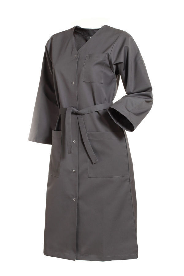 Blouse femme encolure V. Fermeture milieu devant par 6 grippers. Ceinture amovible. Poche poitrine et 2 poches basses plaquées. Manches transformables avec pattes pressionnées. Longueur : 105 cm.