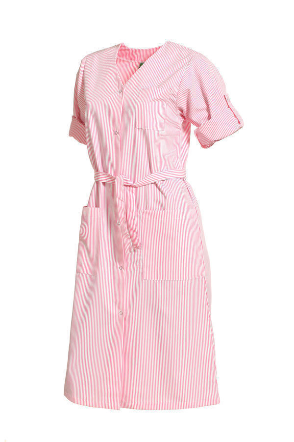 Blouse femme encolure V. Fermeture milieu devant par 6 grippers. Ceinture amovible. Poche poitrine et 2 poches basses plaquées. Manches transformables avec pattes pressionnées. Longueur : 105 cm.
